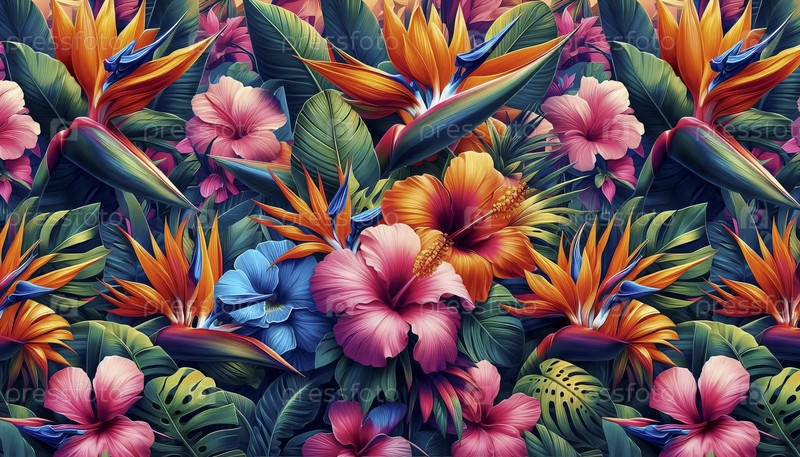 Яркий тропический экзотический цветочный бесшовный образец, Ai generated image