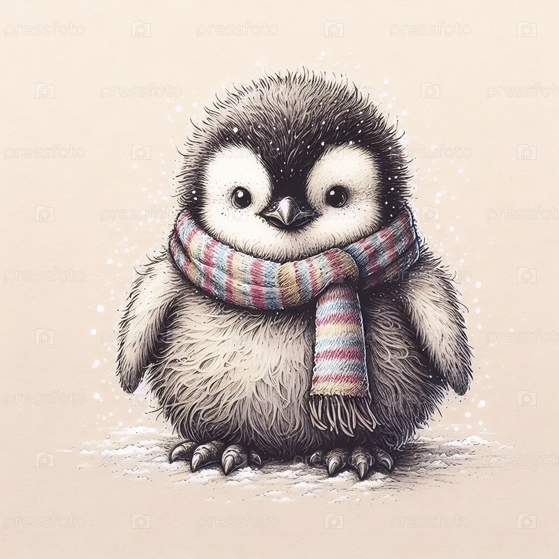 Ребенок пингвин с шарфом чернил рисует художественный принт, Ai generated image