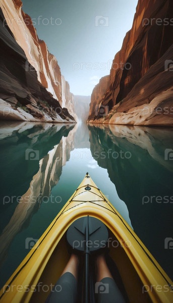 Перспектива байкеров: нос каяка пересекает совершенно неподвижно, отражая воду в узком каньоне, Ай создал изображение