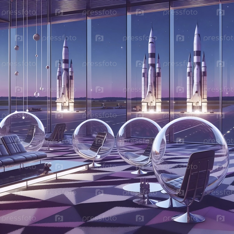 Салон космодрома с пузырьковыми стульями и панорамным видом на запуски ракет, Ai generated image