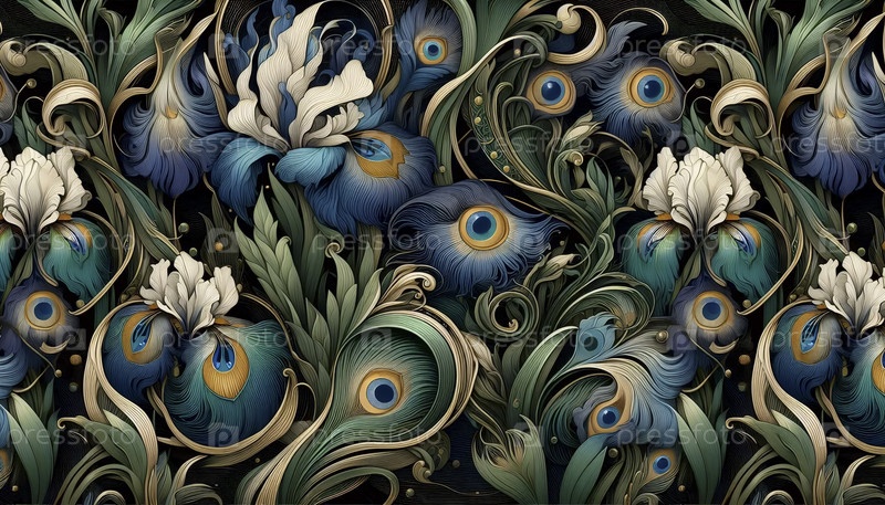 Ирис в стиле модерн и бесшовный рисунок из перьев павлина, Ai generated image