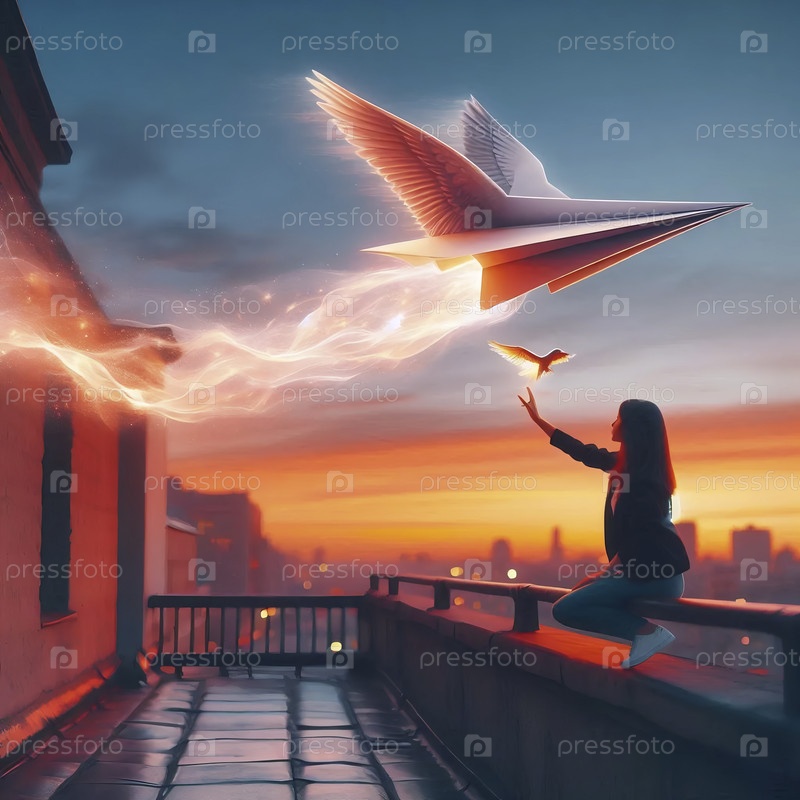 Женщина запускает бумажные самолеты, которые становятся реальными, Ai A generated image