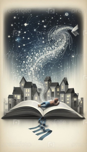 Мечтательная иллюстрация ребенка, летящего на книге, Ai generated image