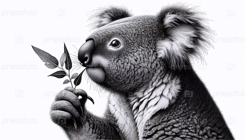 A Koala with a Eucalyptus Leaf ink drawing art print, Ai generated image Коала с эвкалиптическим листом чернил рисование художественная печать, Ай создал изображение