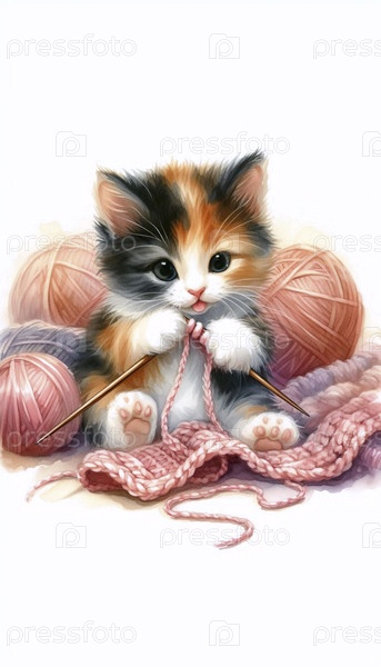 Кошка вяжет шарф акварельный арт-принт, Ai generated image