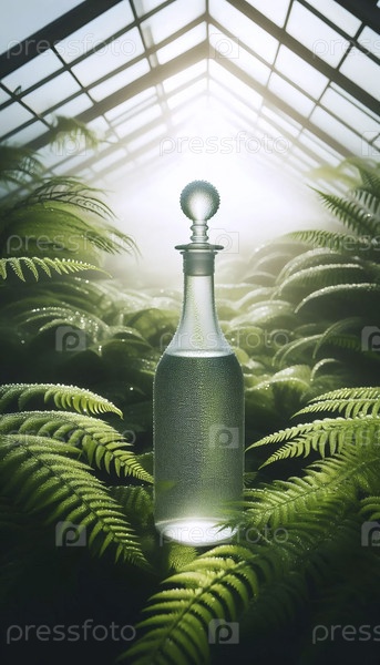 Прозрачный макет стеклянной бутылки с нежной пробкой, стоящей посреди пышного, Ai generated image