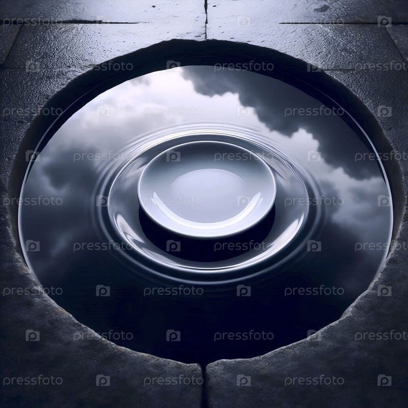 Мокет одной белой фарфоровой пластины, плавающей в бассейне мелководной воды, Ai generated image