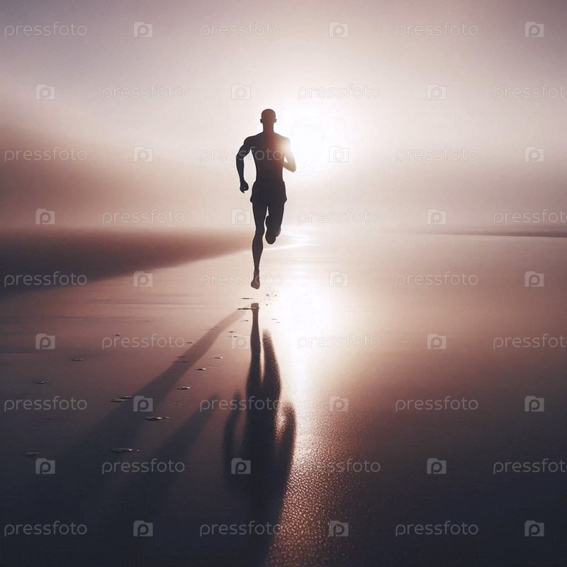 Силуэт одинокого бегуна на туманном пляже при восходе солнца, олицетворяющий свободу и энергию, Ай создал изображение