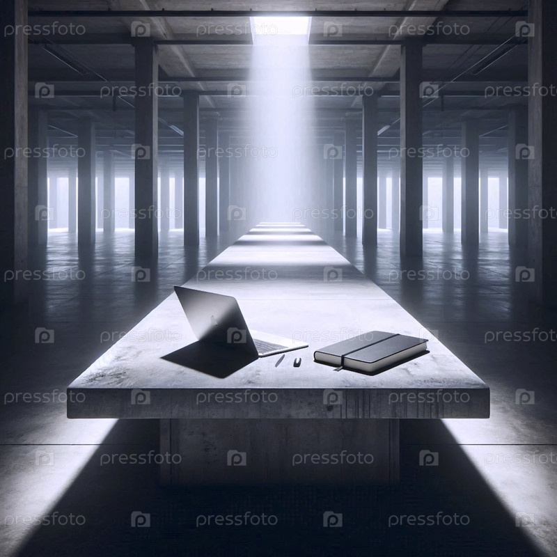 Минималистское рабочее пространство предпринимателей: один ноутбук и блокнот в обширном, наполненном светом лофте