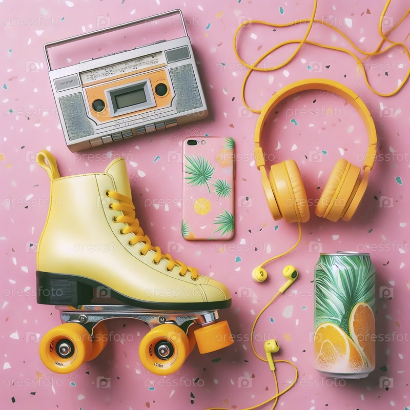 Игровой плоский слой роликовых коньков и тропическая фруктовая банка соды на розовом полу из терраццо, Ai generated image