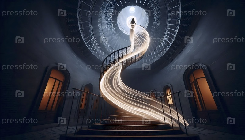 Фотография с длинной экспозицией фигуры, поднимающейся по спиральной лестнице, Ai generated image