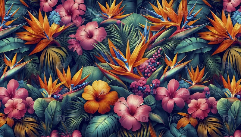 Яркий тропический экзотический цветочный бесшовный образец, Ai generated image