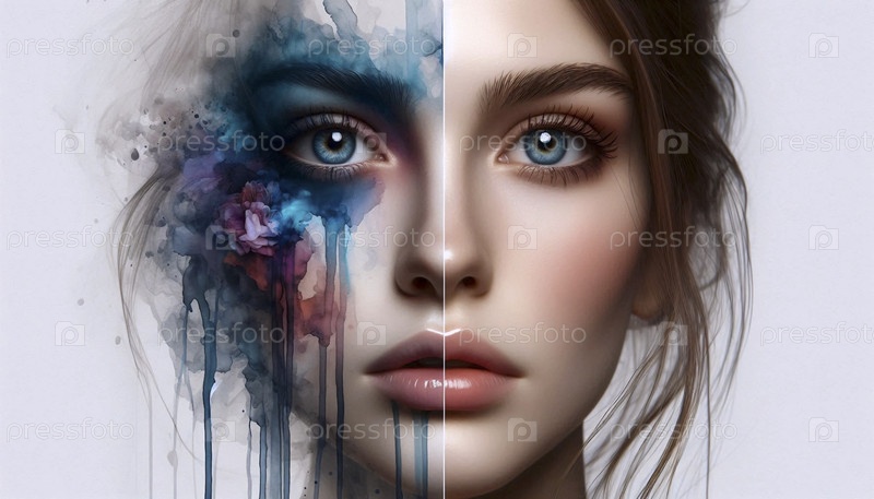 Половина фото, половина акварельный портрет, Ai generated image