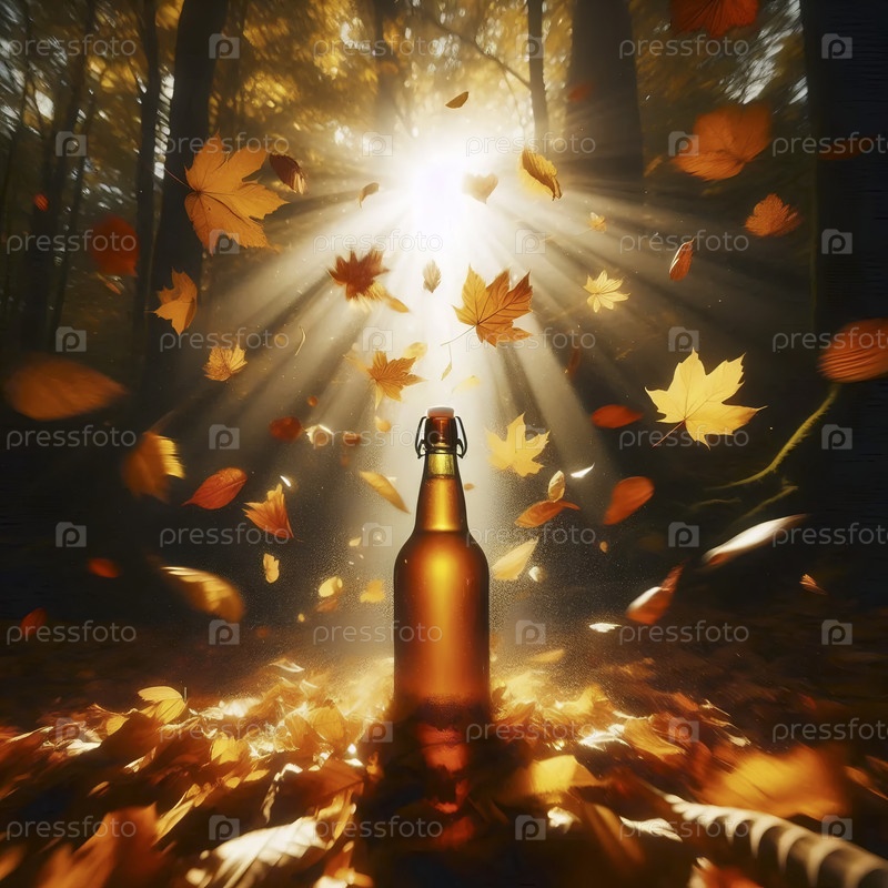 Макет бутылки с золотым оттенком, пойманный в середине осени среди вихревого каскада желтых и оранжевых кленовых листьев, Ai generated image