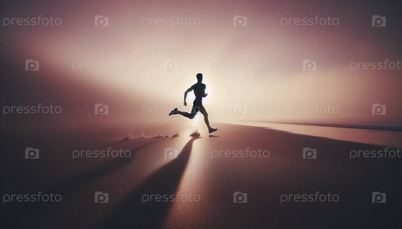Силуэт одинокого бегуна на туманном пляже при восходе солнца, олицетворяющий свободу и энергию, Ай создал изображение