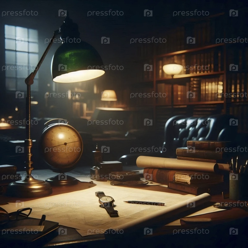 Более широкий снимок слабо освещенного кабинета с часами в фокусе, созданный изображением Ai