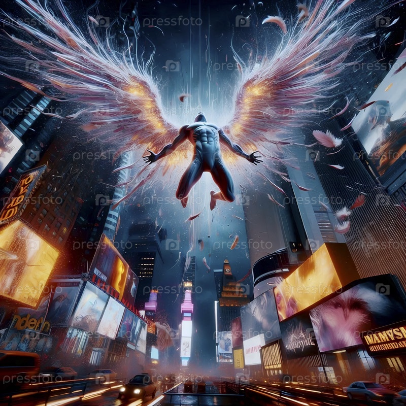 Ангел падает через Таймс-сквер Биллборд, Ai generated image