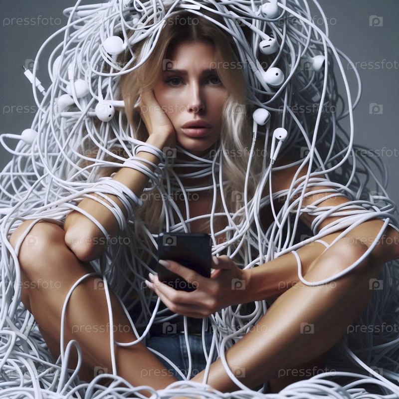 Женщина, запутавшаяся в паутине проводов для наушников, Ai generated image