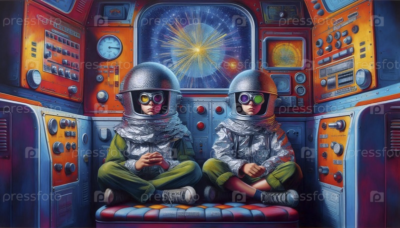 Научно-фантастический плакат детей в картонном космическом корабле, Ai generated image