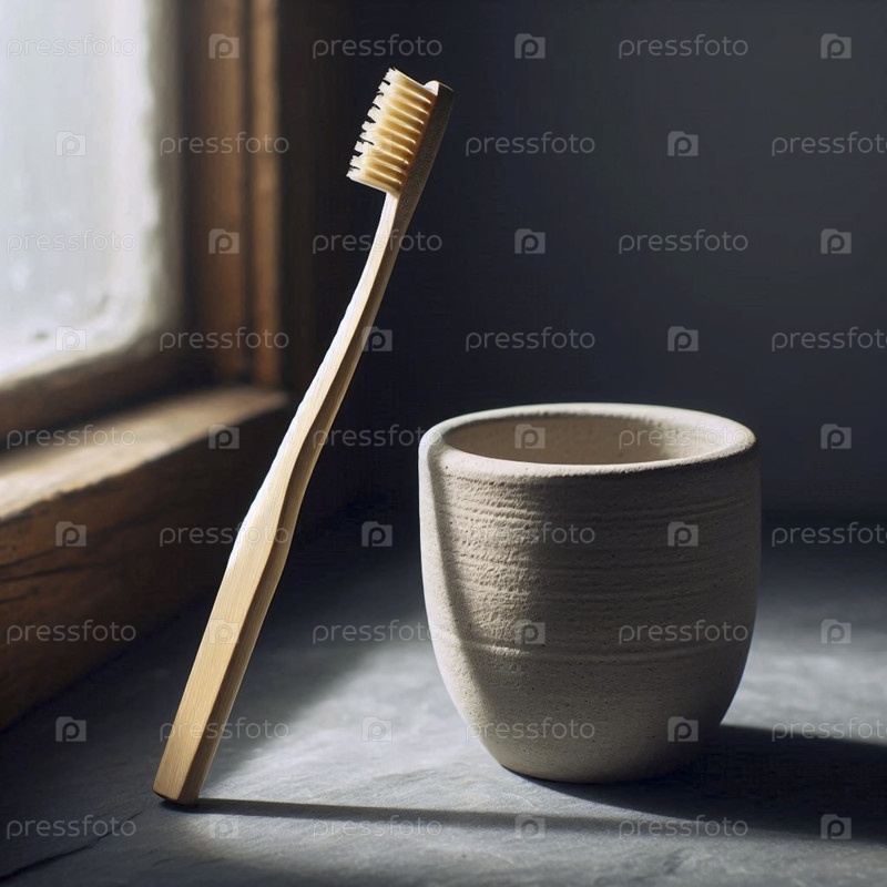 Мокет зубной щетки из бамбука, стоящий прямо в простой сырой глиняной чашке на стеклянном подоконнике, Ai generated image