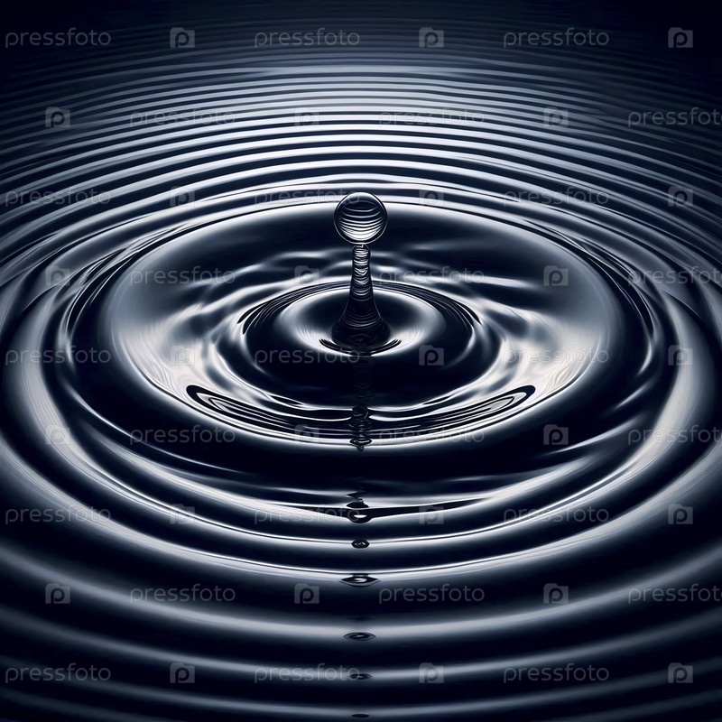 Чрезвычайно крупный макет поверхностного напряжения воды, нарушенного одной каплей, показывающий идеальные концентрические волны, Ai generated image