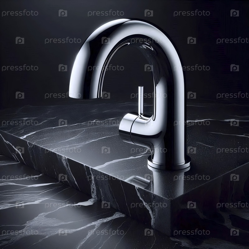 Мокет полированного хромированного крана на фоне абсолютного черного гранита, Ai generated image