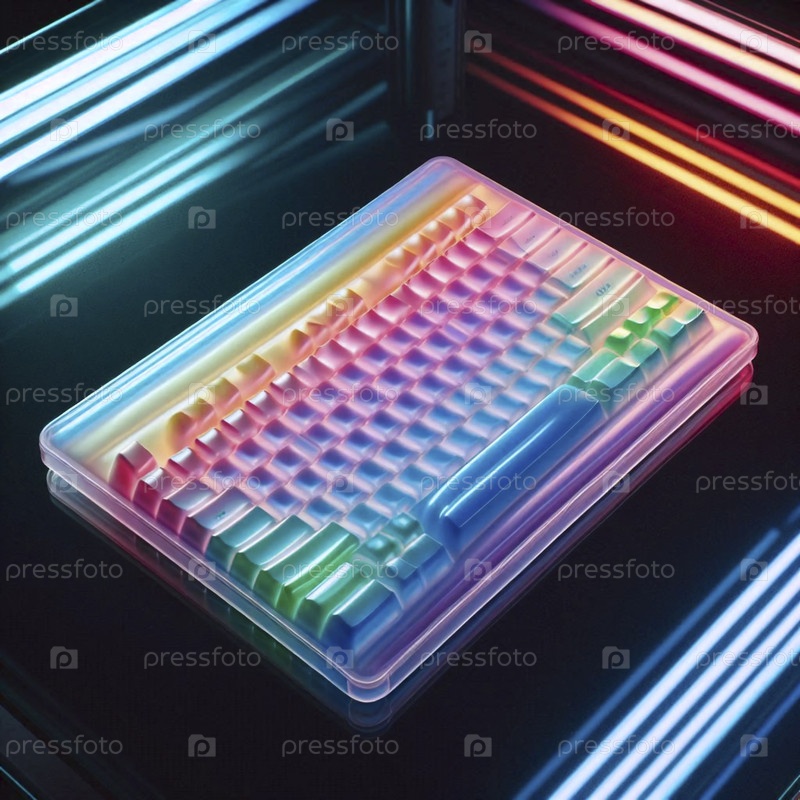 Прозрачный макет кожи клавиатуры с радужным гелем, установленный на стеклянном столе, Ai generated image