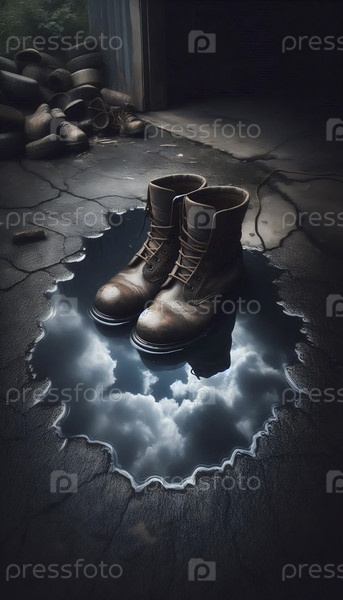 Пара изношенных рабочих сапог заполнена дождевой водой, Ai generated image