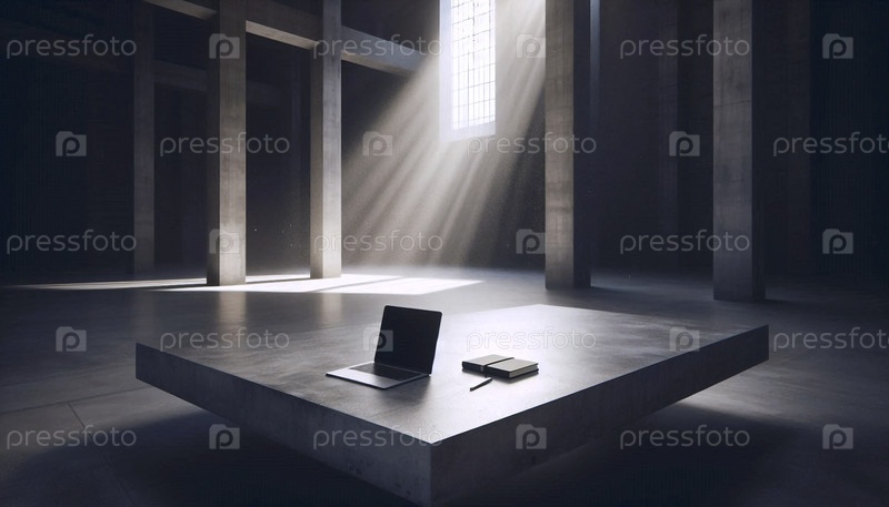 Минималистское рабочее пространство предпринимателей: один ноутбук и блокнот в обширном, наполненном светом лофте