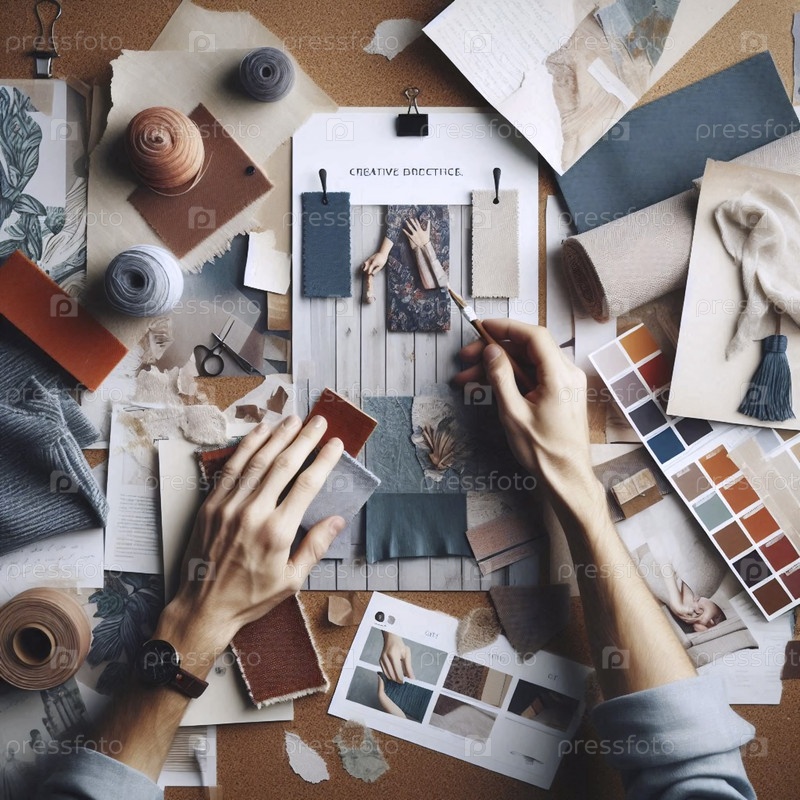 Руки креативных директоров организуют материалы для mood board: образцы ткани, чипы краски и вдохновляющие принты, Ai generated image