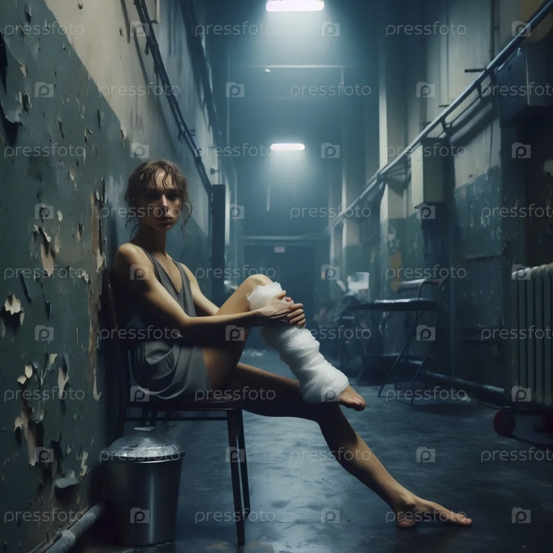 Широкий, экологический снимок, где танцовщица сидит одна на холодном металлическом стуле в туманном коридоре за кулисами
