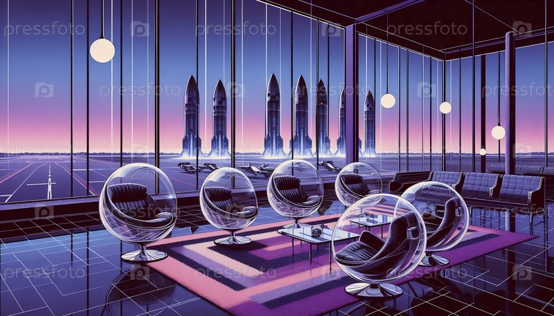 Салон космодрома с пузырьковыми стульями и панорамным видом на запуски ракет, Ai generated image