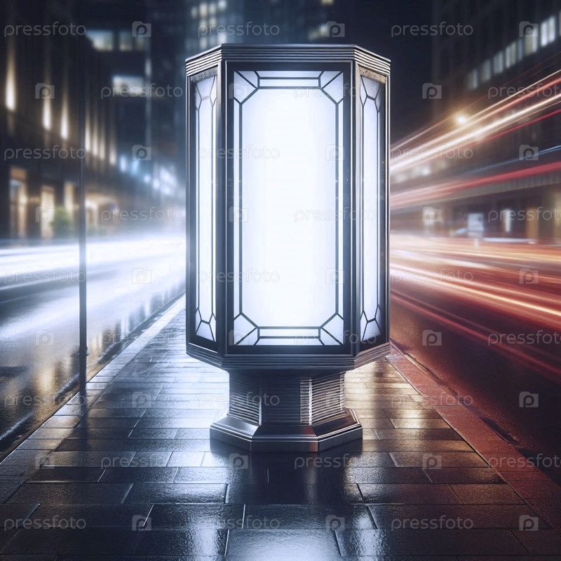 Макет рекламной колонки citylight, пустой и освещенный изнутри, на мокрой отражающейся городской тротуаре ночью Ай создал изображение