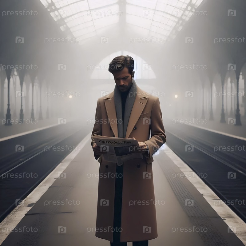 Мужчина в пальто-поло на туманной железнодорожной платформе, Ai generated image