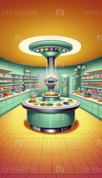 Винтажная кухня будущего с центральной консолью управления и автоматическими приборами для доставки пищи, Ai создал изображение