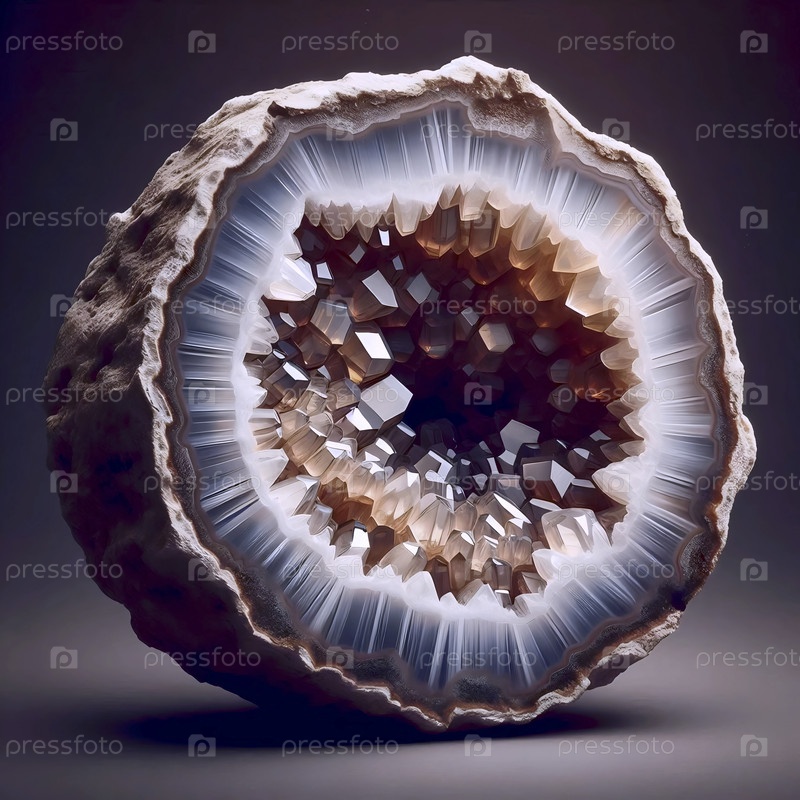 Макромокет слайса геоды, показывающий простую внешнюю кору и захватывающую дух пустую полость, облицованную кристаллическими структурами