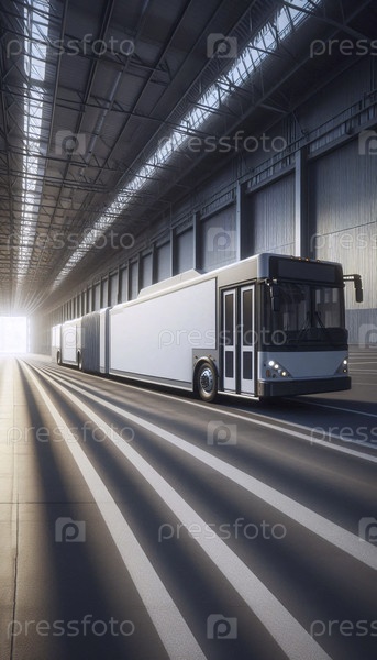 Мокет рекламы автобуса со всей стороны, показывающий совершенно пустую белую обертку на стационарном автобусе в депо, Ai generated image