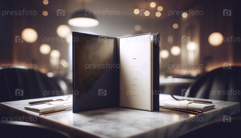 Пустой макет меню ресторана, покрытый кожей, открыт на мраморной столовой поверхности, Ai generated image