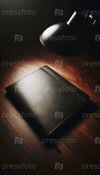 Мокет черного кожаного ноутбука с логотипом слепых, на темном ореховом столе, Ai generated image