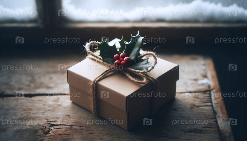 Мокет подарочной коробки из крафт-бумажной бумаги, украшенный веточкой свежей ольхи и ягод на деревянном столе, Ai generated image