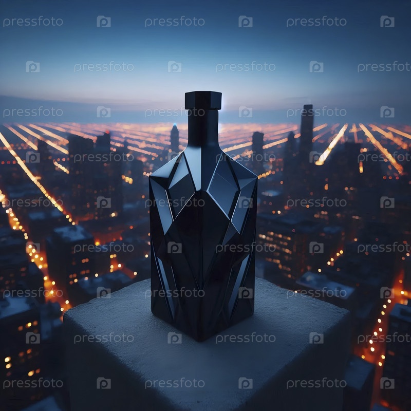 Современный угловой макет бутылки, расположенной на парапете городской крыши во время синего часа, Ай создал изображение