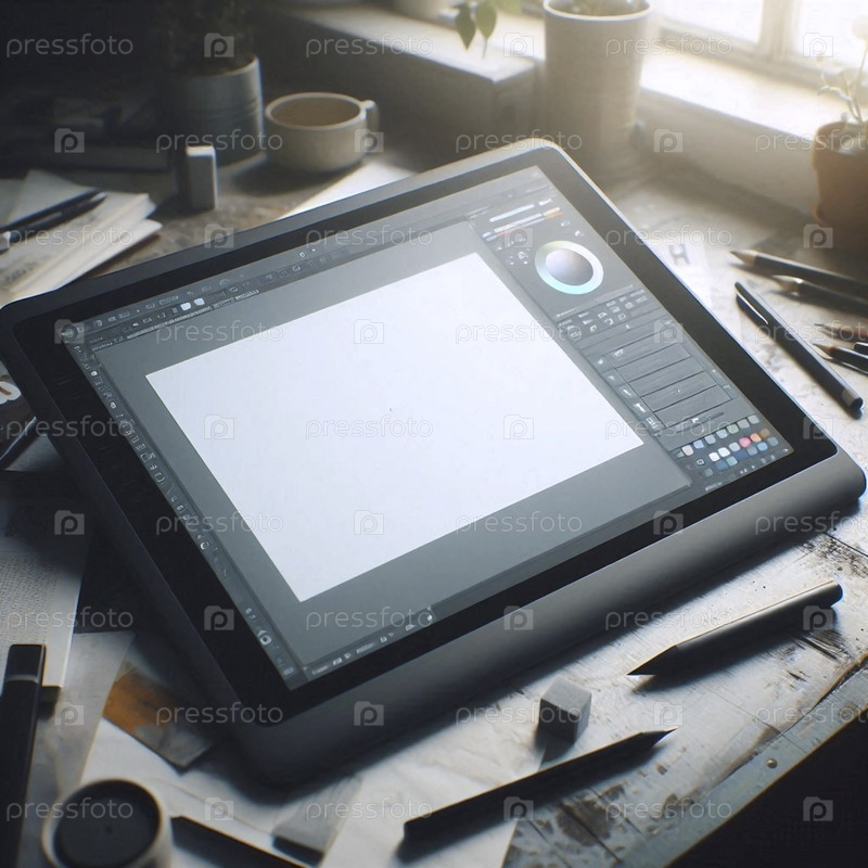 Макет цифрового планшета для рисования, показывающий пустой бесконечный белый холст с одной панелью инструментов, Ai generated image