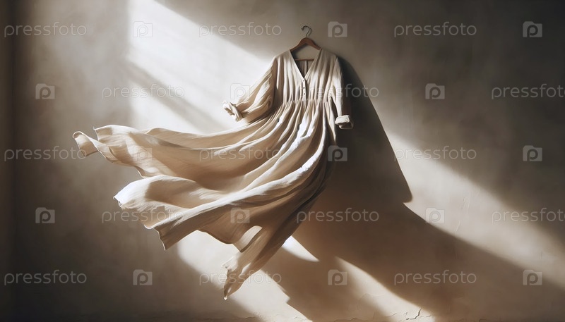 Макет свободного льняного платья в овсяном цвете, мягко дующий перед простой стеной, Ай создал изображение