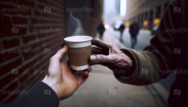 Тихий акт уличной доброты: одна рука предлагает теплый напиток другой, Ай создал изображение