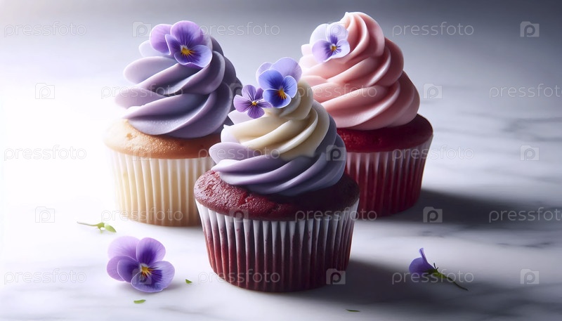 Стол из трех вкусных, безупречно замороженных кексов с небольшим количеством съедобных цветов на мраморной плите Ai создал изображение