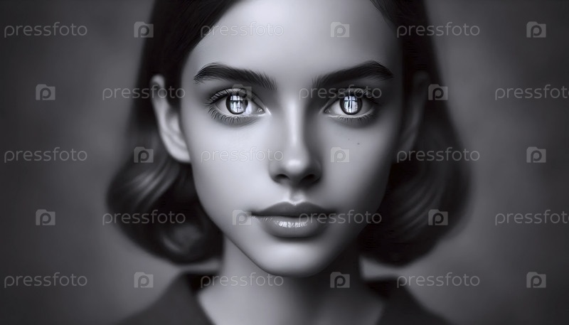 Классический, формально составленный три четверти портрет, где молодая женщина смотрит прямо вперед с нейтральным