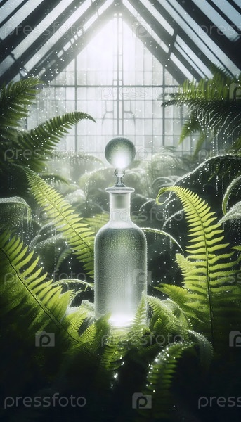 Прозрачный макет стеклянной бутылки с нежной пробкой, стоящей посреди пышного, Ai generated image