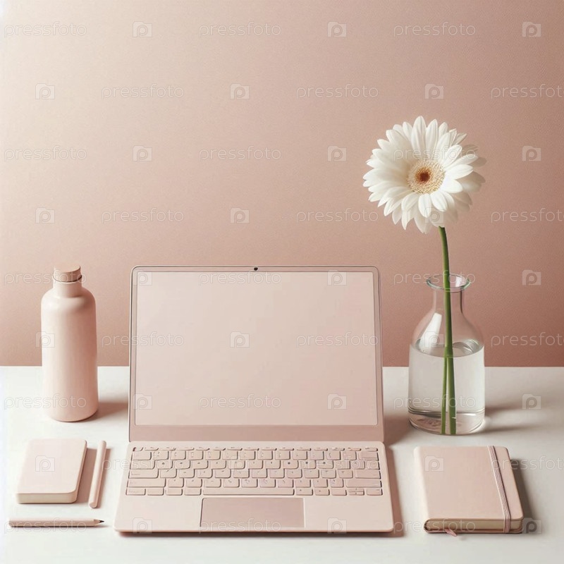 Минималистическое рабочее пространство с пастельно-розовым ноутбуком, одной ромашкой в стакане и изящным блокнотом, Ai generated image