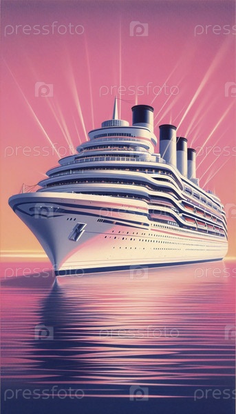 Роскошный океанский лайнер будущего с несколькими террасовыми палубами и атомными двигателями, плавающий на закате, Ai generated image