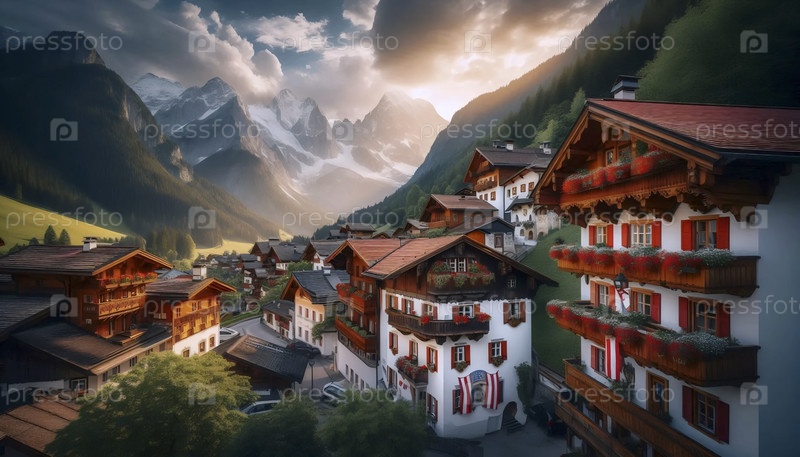 Австрийский флаг в архитектуре альпийских деревень, Ai generated image